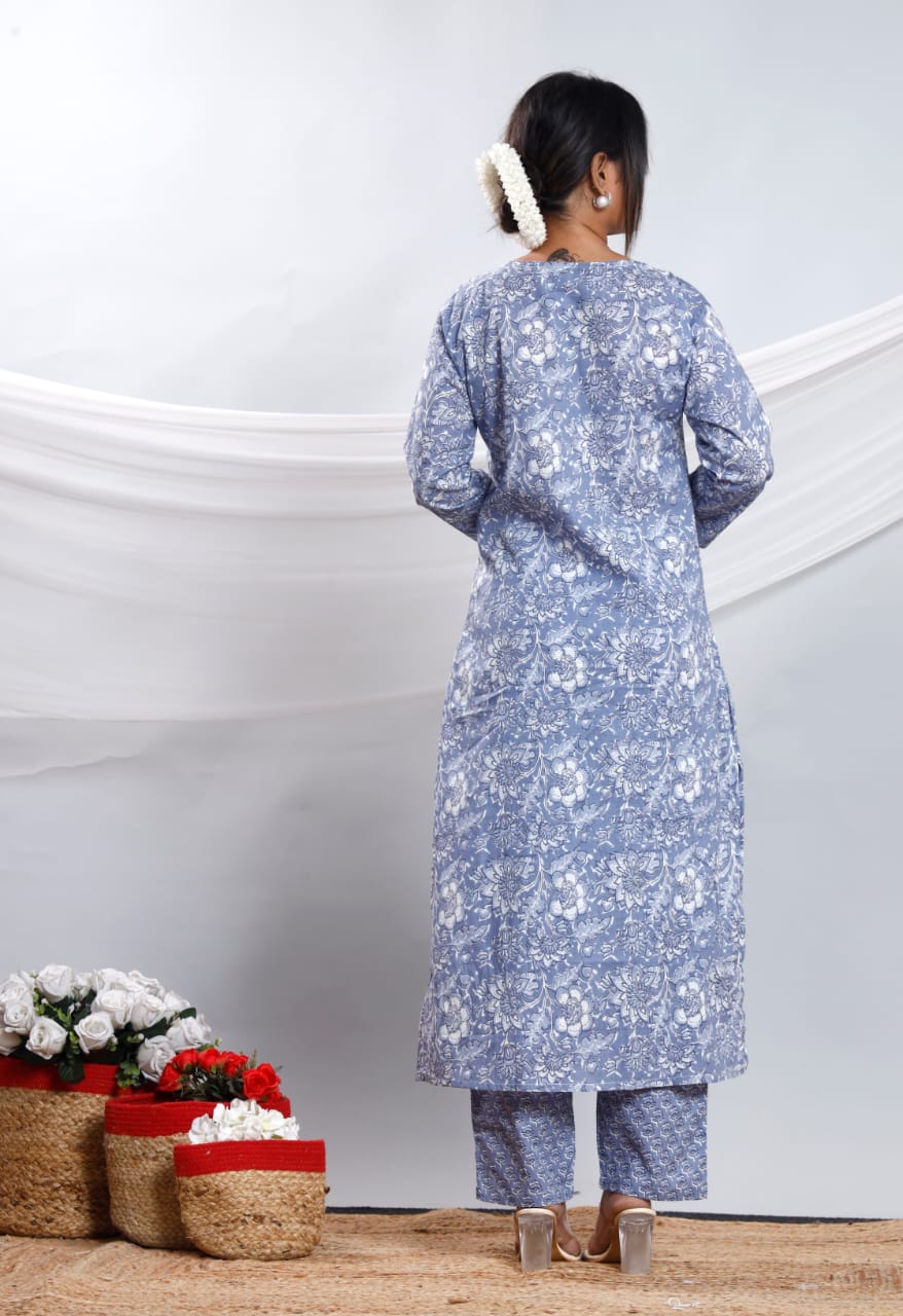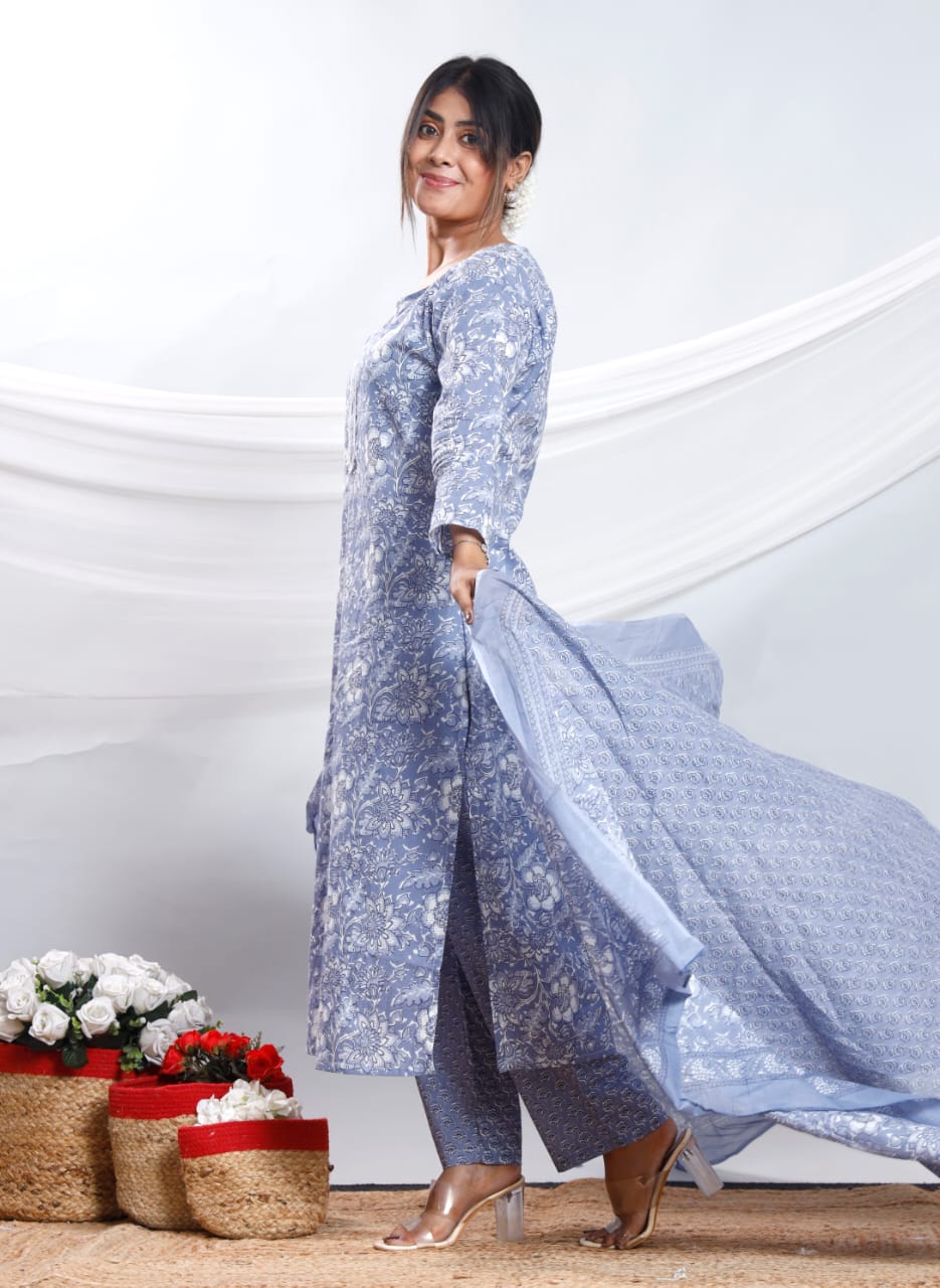 Step into effortless elegance with this three-piece straight kurta set designed in soft, breathable cotton fabric. The soothing grey color with intricate floral prints makes it perfect for both casual outings and festive occasions.