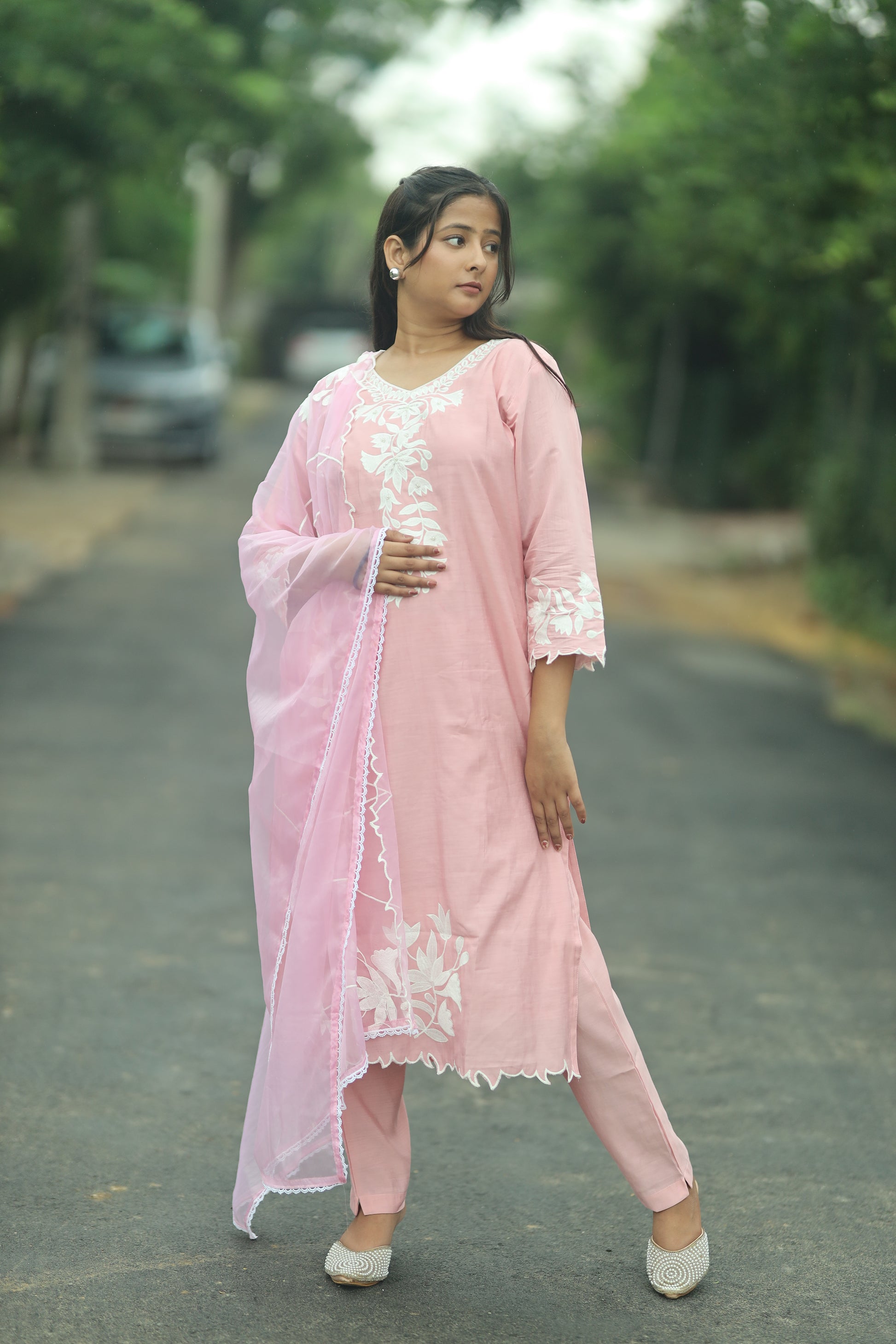 Elegant Pink Roman Silk Cut Work Three-Piece Suit with Dupatta