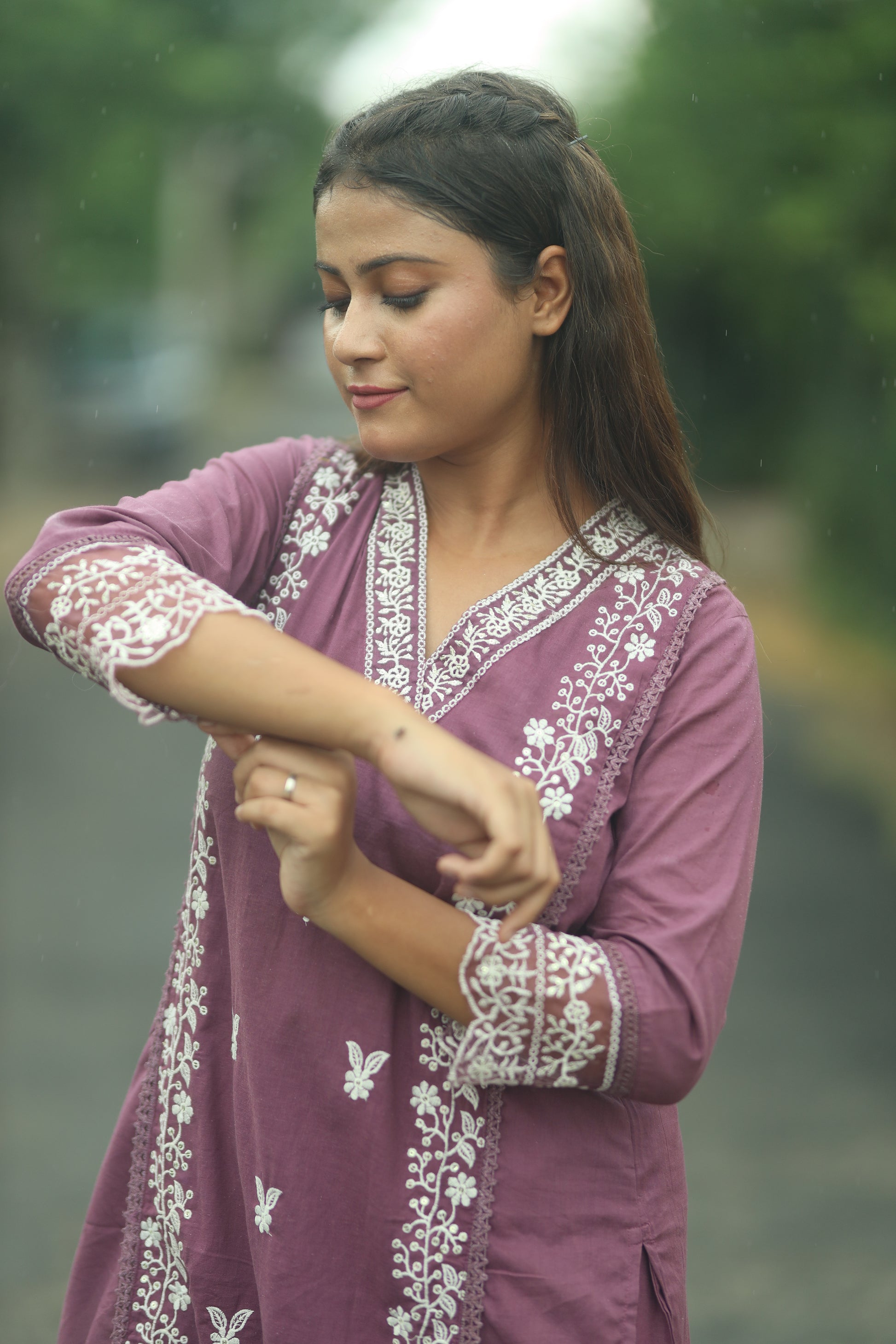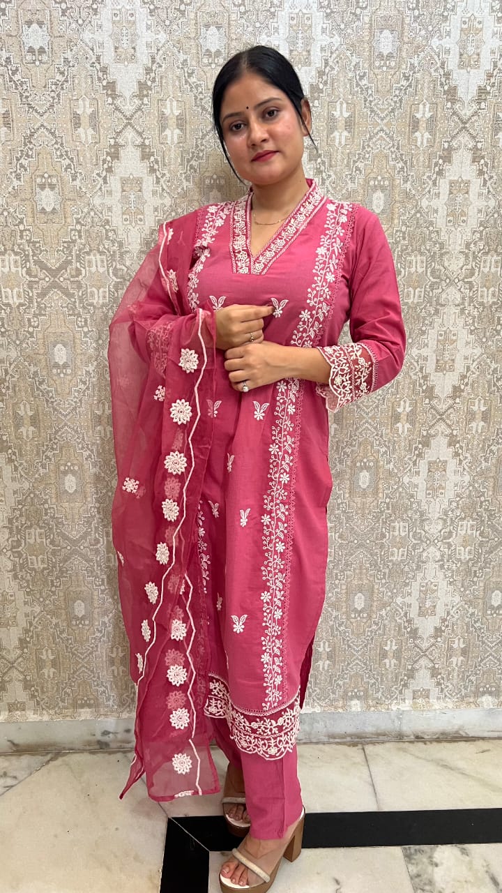 Experience timeless elegance with this Pakistani-style three-piece suit, crafted in soft cotton fabric for all-day comfort. The rich magenta hue with delicate embroidery work and a flowy tissue dupatta adds a touch of sophistication to your ethnic wardrobe.